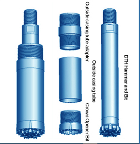 ![]() | 1,Firstly, connect the crown opener bit and the external casing tube, the drill head of the rig impacts the advancing of the extemal casing tube, until the completion of the first tube. |