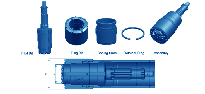 | Outer Dia(A) mm | Inner Dia(B) mm | Reamed Dia(C) mm | Inner Dia.of Casing Shoe(D)mm | Max Outer Dia.of Normal Bit(F)mm | Hammer Type(E) | Drill Pipe mm |